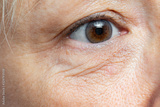 Macro detail of under eye wrinkles on middle aged woman.