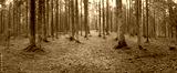 panorama of an old spruce forest with moss on the ground
