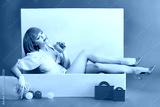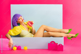 beautiful girl in purple wig as doll drinking from jar while sitting in blue box with balls and shopping bags, on pink