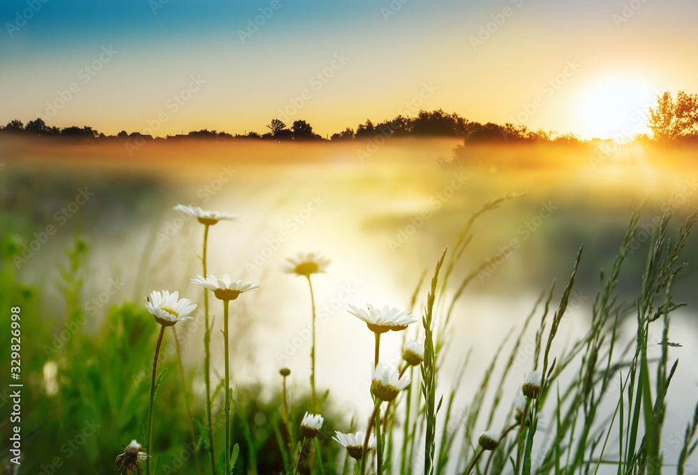 Daisy flowers by the river on an early foggy morning at dawn. Beautiful morning on a wild river in spring or summer.