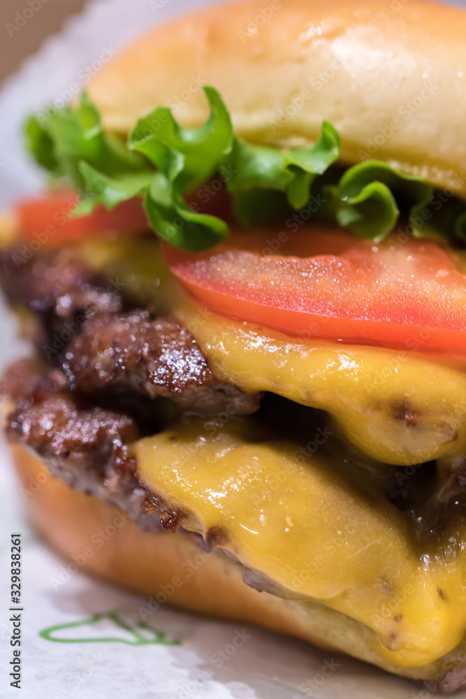 Double cheeseburger with tomato lettuce and onion, Cheese Fries and Milkshake.