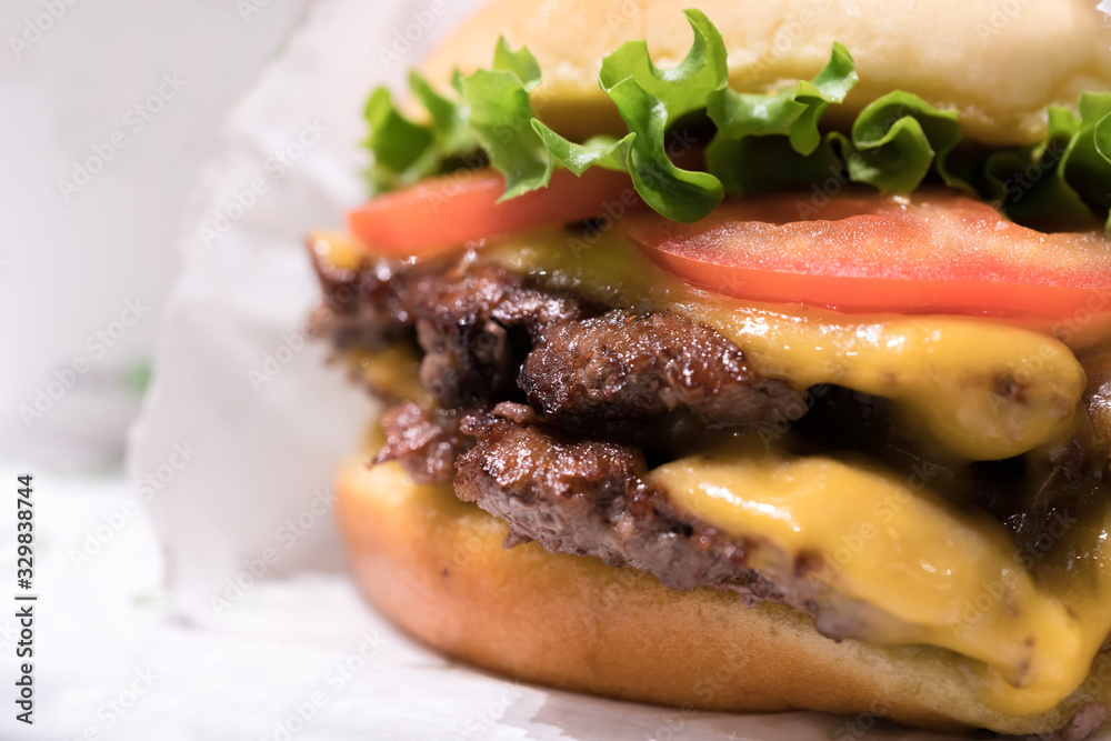 Double cheeseburger with tomato lettuce and onion, Cheese Fries and Milkshake.