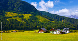 Austrian village among meadows fields and Alpine mountains. Knolls covered with forests and blue sky with clouds. Picturesque summer landscape from Austria.