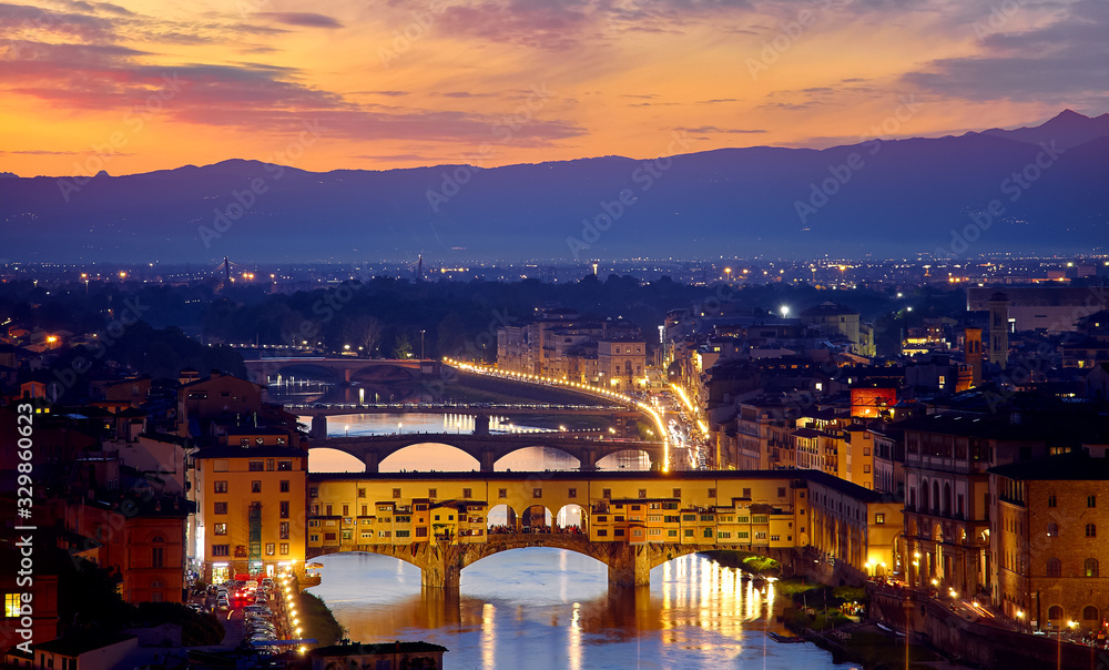 Evening sunset over Florence with Ponte Vecchio bridge on Arno river and tower in Italy.