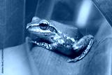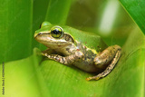 Small Madagascar green tree frog resting on green leaf, closeup detail