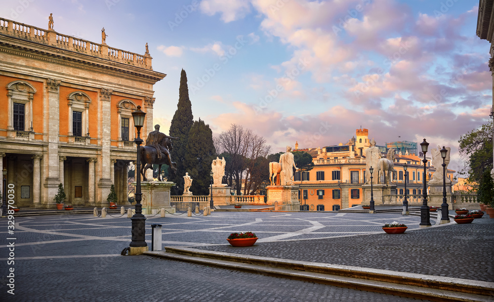 Rome Italy. Bronze statue of Roman Emperor Marcus Aurelius on steed at Capitol square among vintage buildings with ancient architecture. Evening sunset with clouds.
