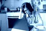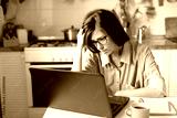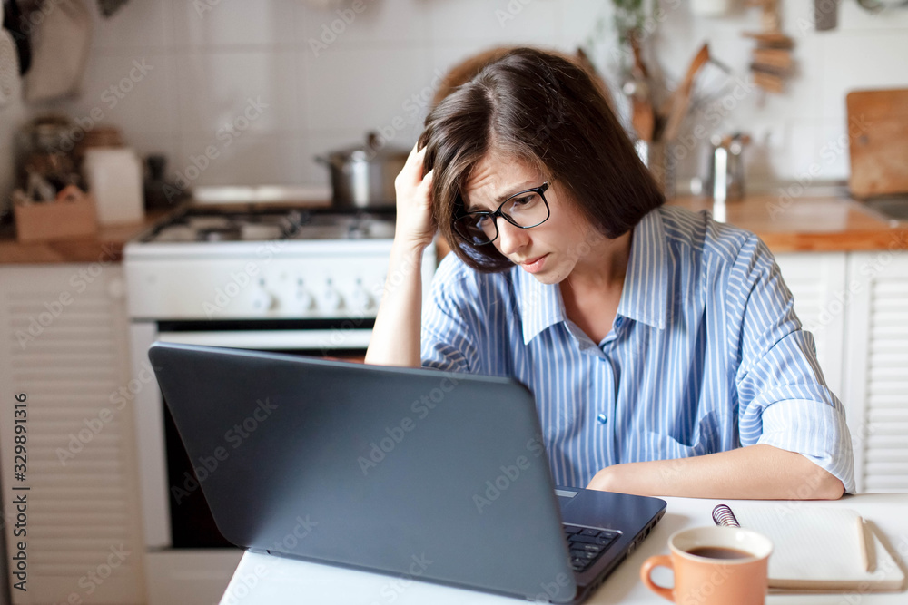 Upset woman working from home office. Worry freelancer using laptop and the Internet. Workplace in cozy kitchen. Concept of female business and career, housekeeping, stress. Lifestyle moment.