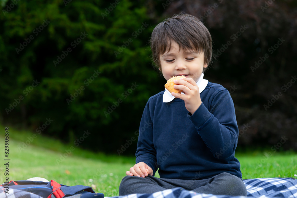 Hungry little boy eating fresh tortilla wraps with chicken, bacon and mixed vegetables, Cute school boy siting having a picnic in the park, kid eating Mexican sandwich food for his dinner