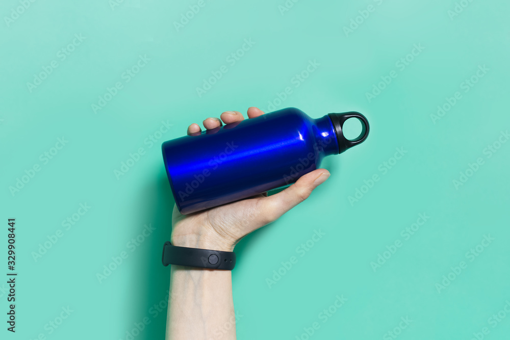 Close-up of female hand holding a reusable eco, thermo water bottle of phantom blue color, isolated on aqua menthe background.