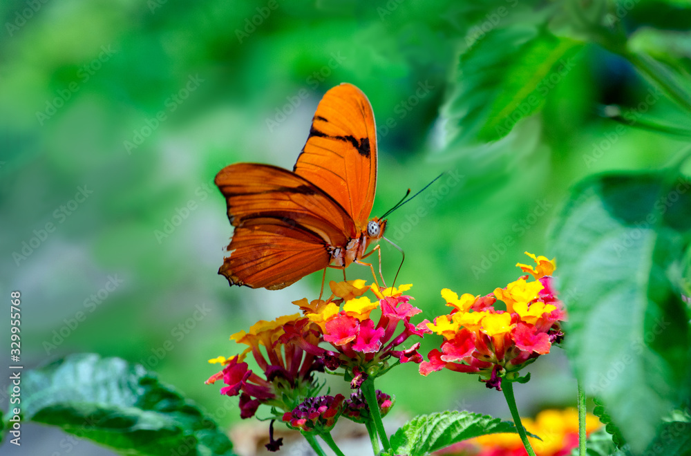 A beautiful Julia butterfly in a pretty garden with colorful flowers