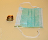 Coins and sanitary / hygienic face mask close up isolated on pastel color background