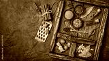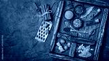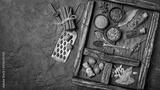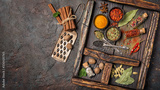 Different spices, dry kitchen herbs and seeds for tasty meals in wooden drawer