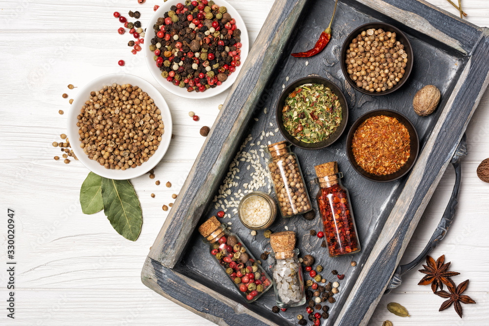 Different spices, kitchen herbs and seeds for tasty meals in wooden drawer