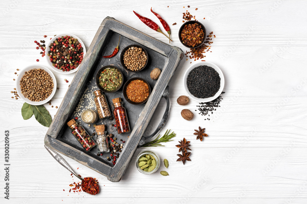 Different spices, kitchen herbs and seeds for tasty meals in wooden drawer