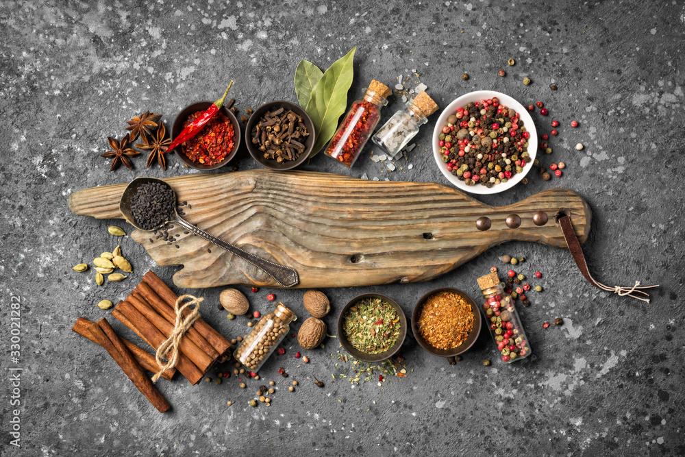 Different spices, kitchen herbs and seeds for tasty meals with wooden board