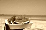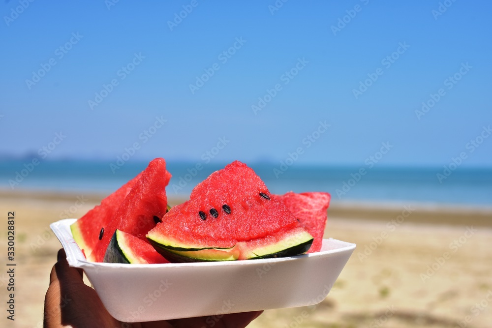 The watermelon is cut into pieces with the sea view and the blue sky.
