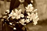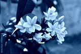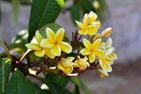 group of yellow white and pink flowers (Frangipani, Plumeria) White and yellow frangipani flowers with leaves in background.Plumeria flower blooming