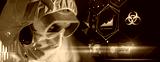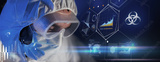 science, technology and pandemic concept - close up of scientist in goggles and protective mask over virtual projections with worldwide biohazard caution on dark blue background