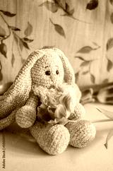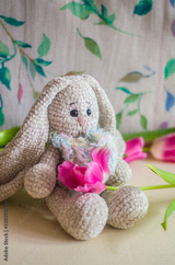 Knitted light gray handmade crafted rabbit with pink tulips .
