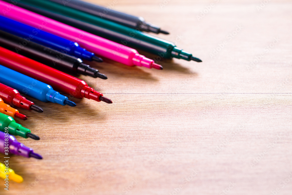 multicolored pencils on the wooden table background