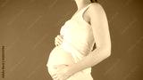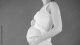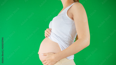 Young pregnant woman's belly close up with her hands on her tummy stroking the baby. Beautiful background photo of pregnancy and maternity
