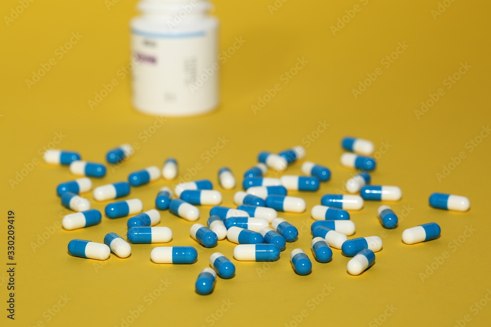 Pills capsules tablets antibiotic lie on yellow background, behind plastic pharmacy bottle in soft focus
