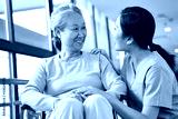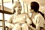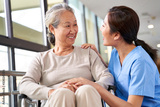 friendly asian staff talking to senior resident in nursing home