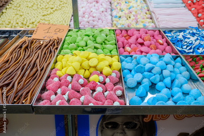 Trays of colorful candies on display at a street fair