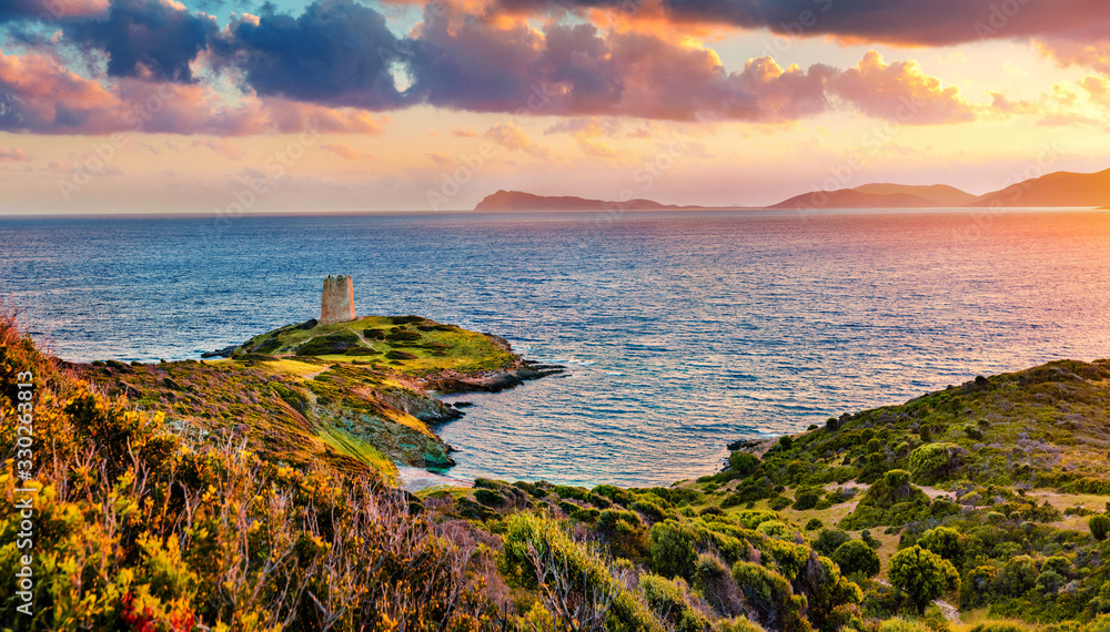 Panoramic sunset view of Piscinni bay with Torre di Pixinni tower on background. Fantastic evening scene of Sardinia island, Italy, Europe. Beautifel Mediterranean seascape.
