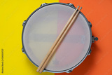 Drum stick and drum on yellow and orange color table background, top view, music concept