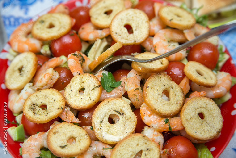 Texture of salad with cherry tomatoes , crackers, prawns and herbs