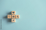 Health medical Insurance Concept, Wood cube with medical symbol on pastel blue background, copy space.