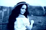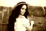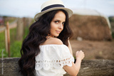Attractive smiling model girl in a dress and light summer hat with a brim. Lifestyle summer portrait of a beautiful young woman wearing a hat with brim posing in a rural background