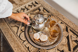Woman hands serving traditional moroccan mint tea ceremony with cookies and vintage silver teapot. Hospitality and service in Morocco, Marrakech.