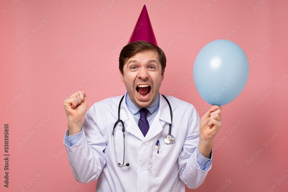 Young caucasian doctor in party holiday is glad with recovery of his patient.