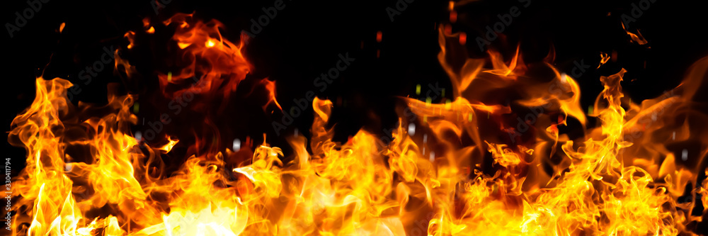 Panorama Fire flames on black background. fire burst texture for banner backdrop.