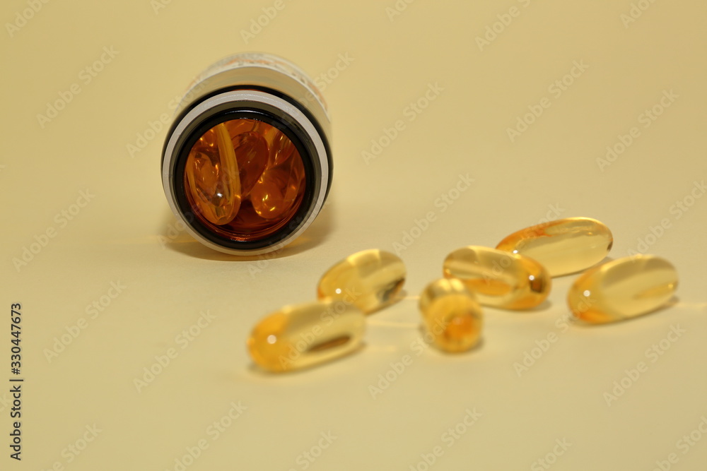 Open glass dark bottle with gel capsules inside few other capsules in soft focus on pastel color background