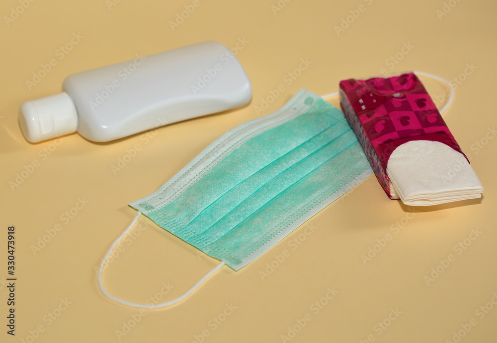 Hygienic face mask, pack of tissues and white plastic bottle close up isolated on pastel color background