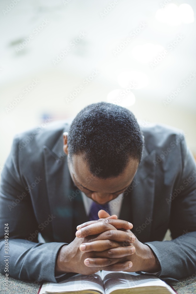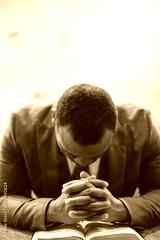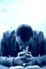 Lonely african-american male praying with his hands on the Bible with his head down
