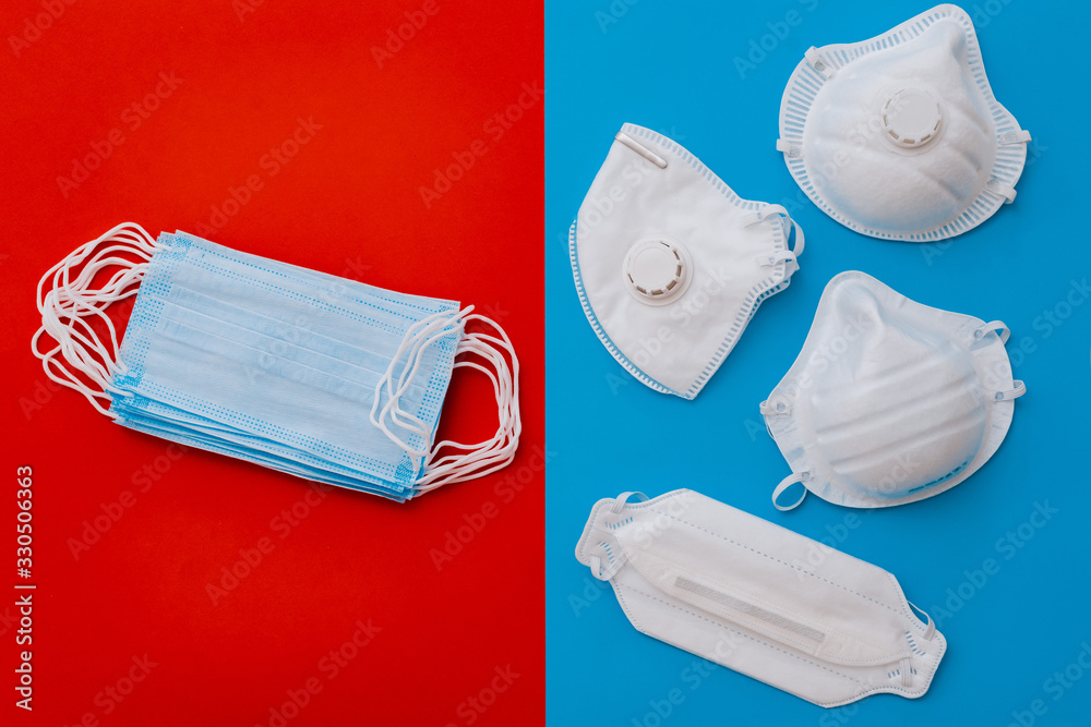 White variety mask respirator on a blue background. The face mask protects against environmental pollution, flu viruses and coronavirus.