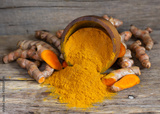 Turmeric powder and fresh turmeric (curcumin) on wooden background,Used for cooking and as herbal medicine.