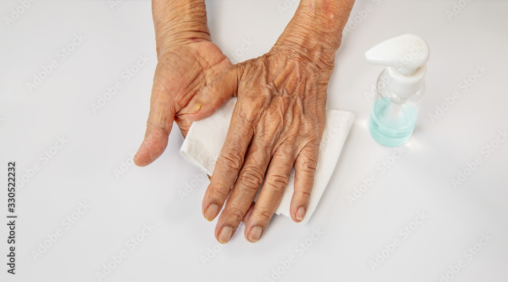 Elderly woman applying alcohol gel cleaning hands to helping protect from coronavirus covid-19
