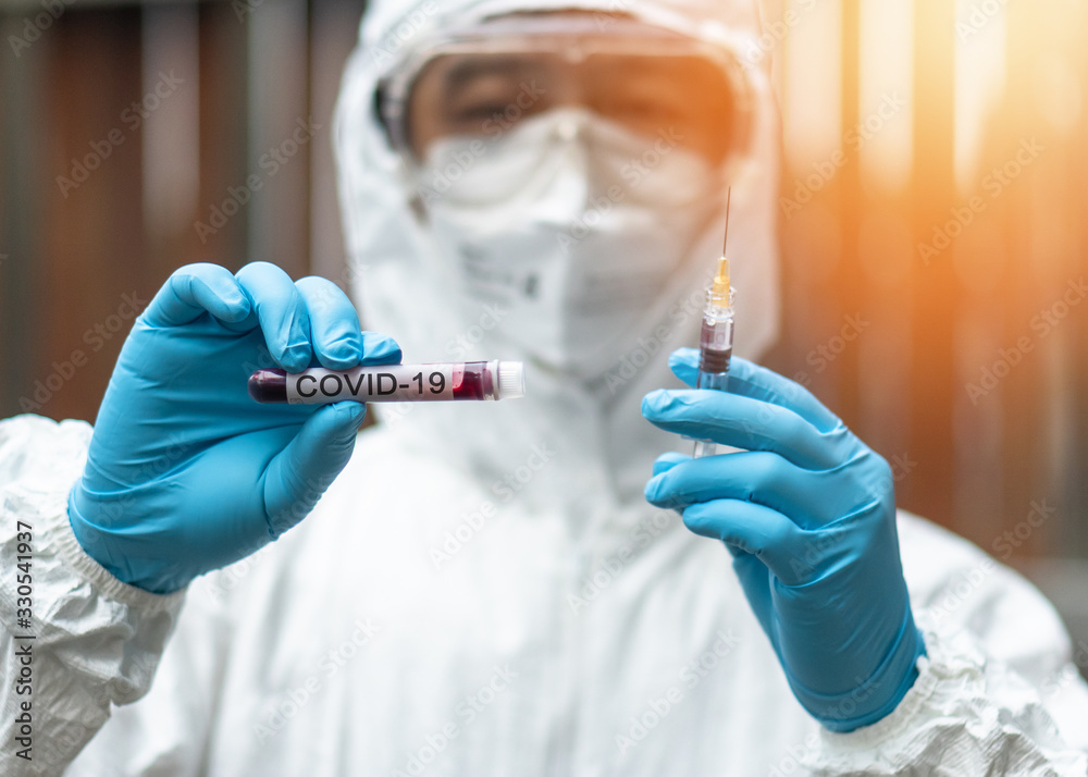 COVID-19, Corona Virus epidemic disease with doctor in PPE Personal Protective Equipment holding vaccination syringe, vaccine and blood test tube