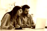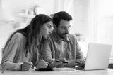 Focused young couple calculating bills, discussing planning budget together, serious wife and husband looking at laptop screen, using online banking services and calculator, checking finances