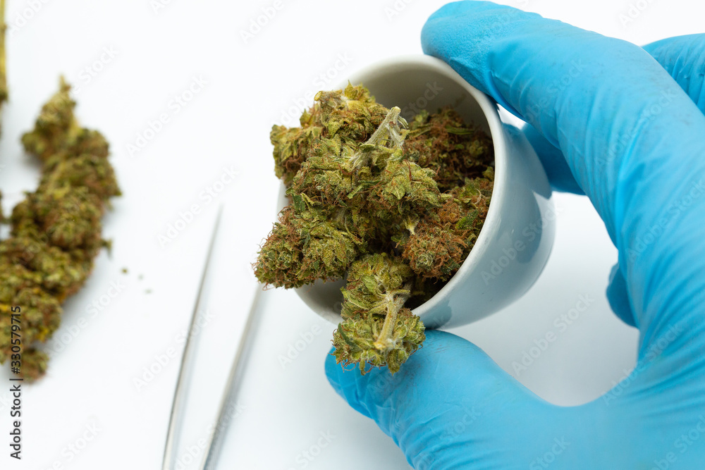Hand in blue protection glove holding white porcelain dish full of dried cannabis buds. Marijuana for medicinal purpose. Medicine, drugs and health care concept...
