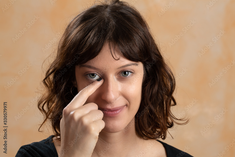 Portrait of attractive brunette woman looking to camera. Girl touching her face by pointing finger...