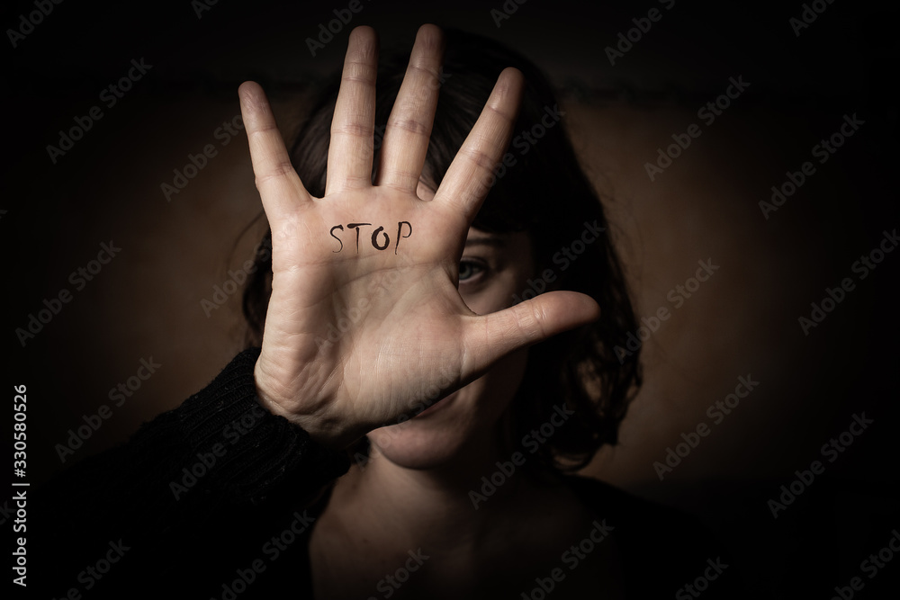 Caucasian woman showing her palm on stretched arm. Stop sign, don't come closer. Focused on hand. Emotions, body language concept...