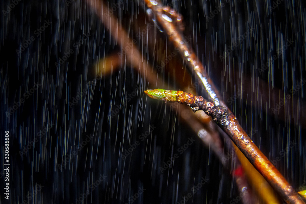 A kidney of a birch close up. The leaves bloom in the spring on the tree. Black background, copy space. Rain, wet weather.