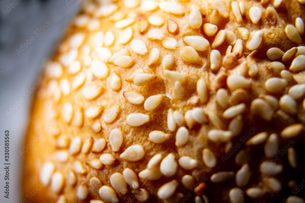 Delicious Burger bun with sesame close-up. Background of sesame seeds. Copy space.