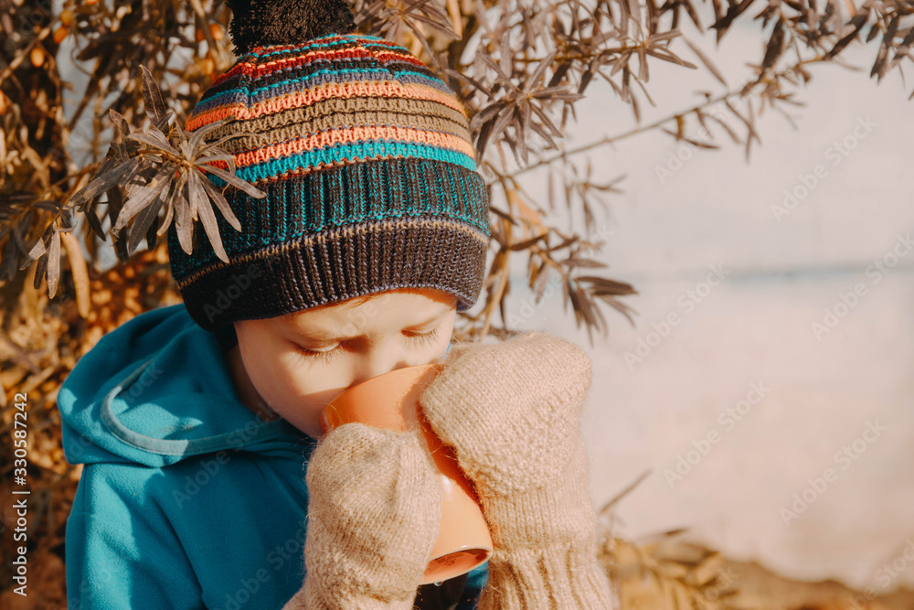 Boy in the hat and mittens drinking tea from a mug on the outdoors